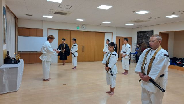 道院に新たな仲間を迎える行事です。新入門者は門信徒と参列者の前に立ち、入門の決意を誓います。入門式において道院長より話される法話は、生涯続けていく金剛禅の修行において、最も大切な事柄になります。入門式は、金剛禅の修行をする門信徒にとって、一生に一度しかない大切な儀式で、この日を境に、「本当の強さ」と「生きることの意味」を日々考え、行動する人間へと変わっていく第一歩を踏み出します。