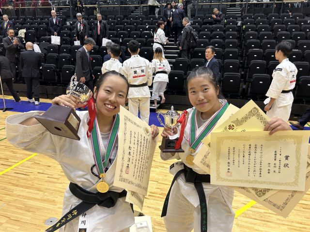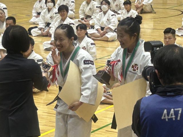 大和郡山南道院所属の岩田笑さんと中川実希さんが、一般女子有段組演武の部で最優秀賞(金メダル)に輝きましました。また、一般男子マスターズの部で、竹島昌寿さんと泊明日香さんが優秀賞(銀メダル)に輝きました。