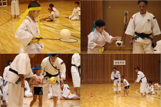 ラケットの上にボールを乗せてパイロンをスラロームして次の人に繋ぎます、子どもたちはムズかしくて反対の手の位置があやしい・・・のもありましたが一生懸命に走ってくれました!