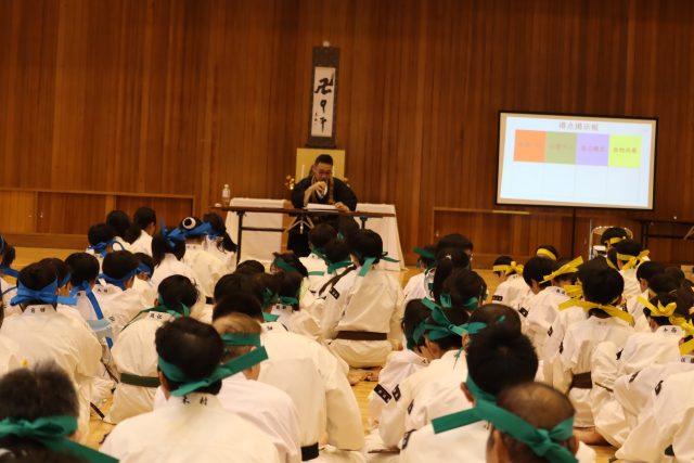 竹澤教区長に少林寺拳法について、開祖がなぜ少林寺拳法を創始し、広めようと思ったのかを参加した拳士やその他の方々に伝えて頂きました。