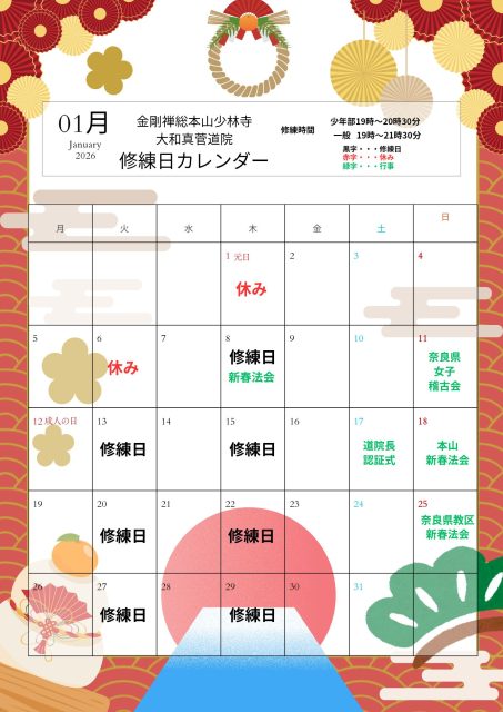 | 2026.01.09 大和真菅道院 2026年1月カレンダー 今年もよろしくお願いいたします1月のカレンダーを掲載いたします。日頃の修練の風景はインスタグラムをメインに投稿していますのでこちらの二次元コードからご覧になって... | |